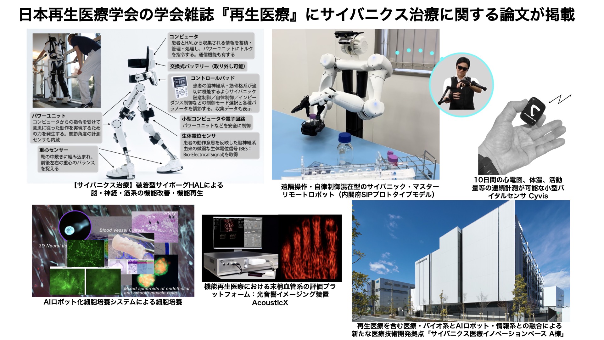 これらに加えて、末梢血管系の評価プラットフォームとしての光音響イメージング装置(AcousticX)、日常的・継続的なバイタルデータモニタリング(Cyvis)、患者データ連携・AI解析(C-Cloud)などが融合することで、細胞・組織・神経回路・身体機能・生活活動などを一体的に改善する”機能再生医療”を現実のものとする【HCPS融合サイバニクス医療健康イノベーション】が、国内外の連携を通して推進されていく。