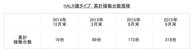 その結果、2つのHAL®腰タイプは、本年度上期に合計229台が新たに稼働を開始し、上期時点で通期予想の180台を大きく上回る結果となりましたので、ご報告いたします。本年9月末時点における累計稼働台数は318台となり順調に増加しております。